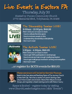 Kerrick Thomas of The Journey Church will be teaching both seminars. He and Nelson Searcy have been a tremendous resource for our church. I would strongly recommend you and some of your staff come to this seminar. You won’t regret it!