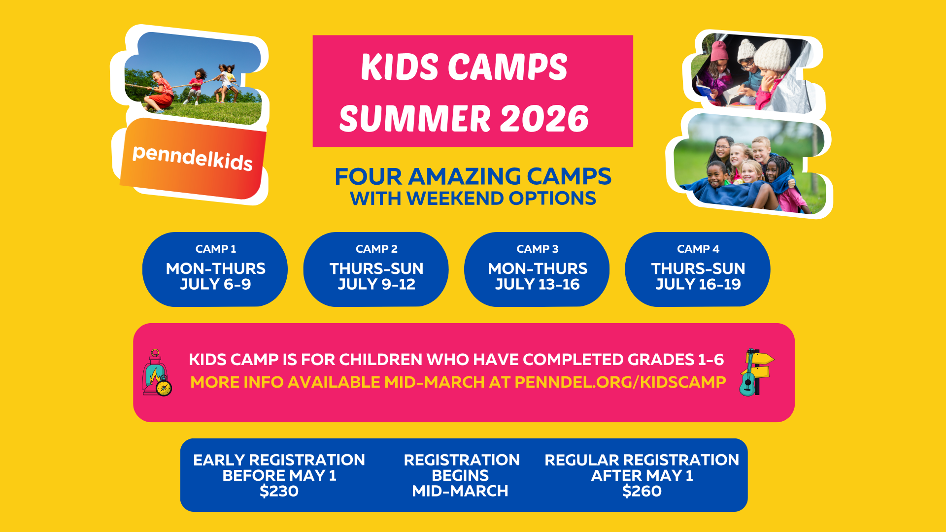 PENNDEL KIDS CAMP is designed to be the best four days of a child's summer. Camp is full of fun and exciting activities, opportunities to build life-long friendships, and creative life-changing services. Click above for details.