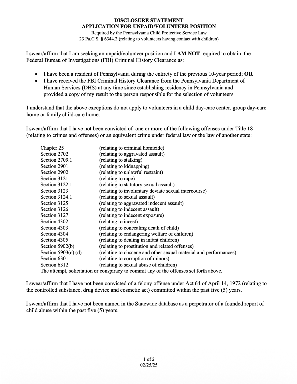 • In accordance with PA State Law, any individual who has not obtained all required clearances should NOT be working with minors under the age of 18.
